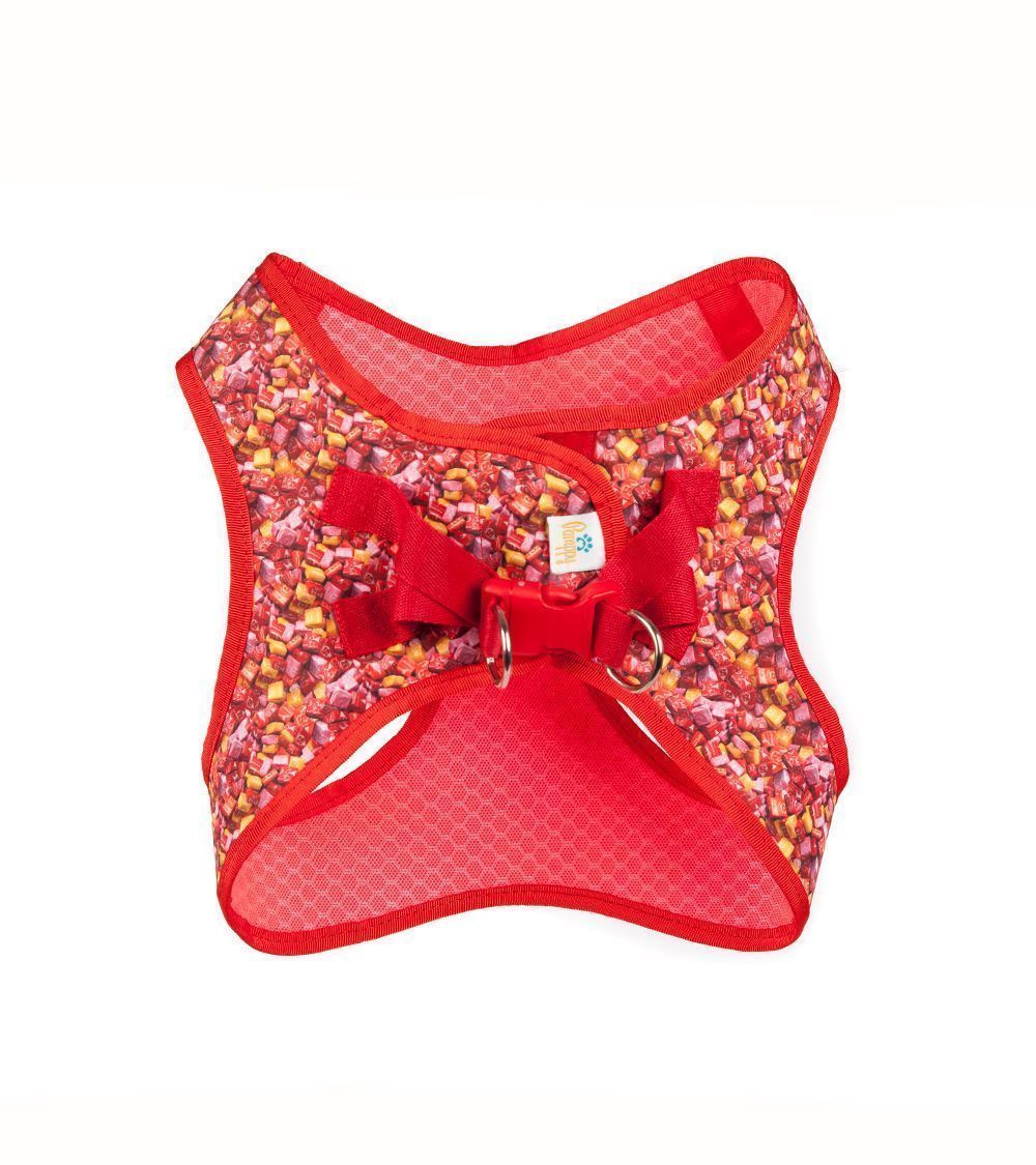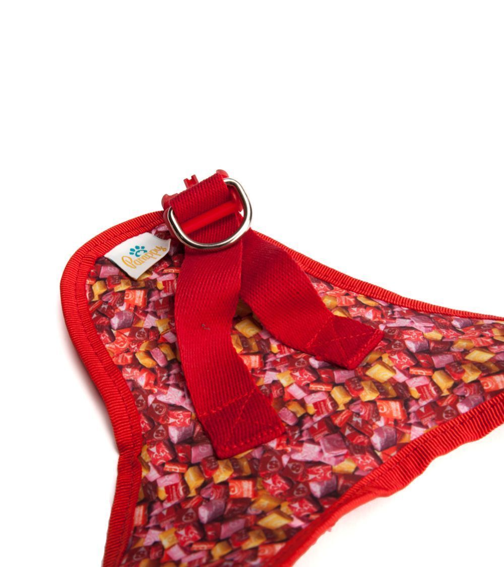 Arnés textil moda en color rojo con estampado de caramelos con elementos metálicos en color plateado y cierre plástico, tejido algodón + poliéster al 50% y forro en material PES.