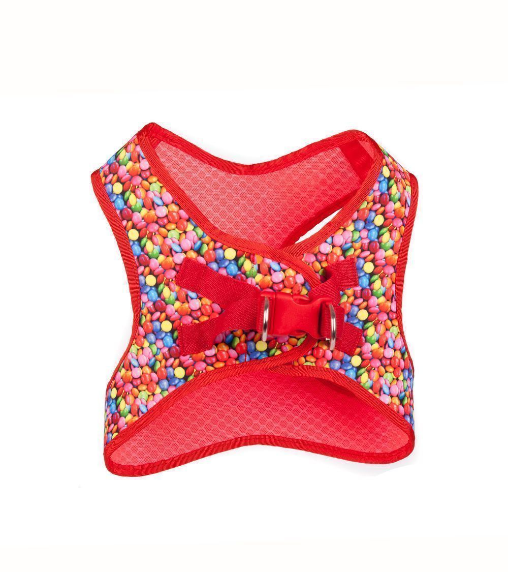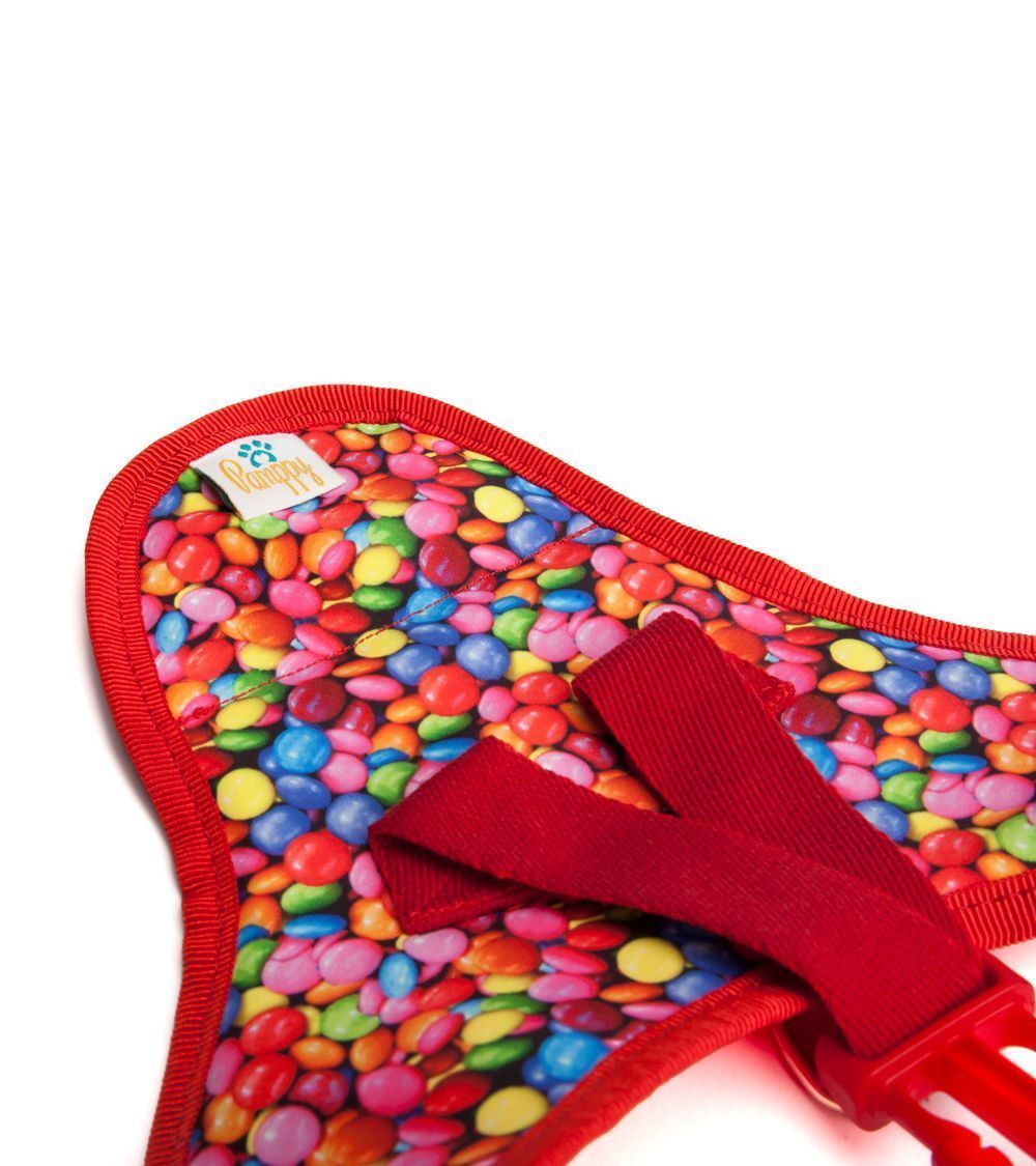 Arnés textil moda en color rojo con estampado de chocolatinas con elementos metálicos en color plateado y cierre plástico, tejido algodón + poliéster al 50% y forro en material PES.