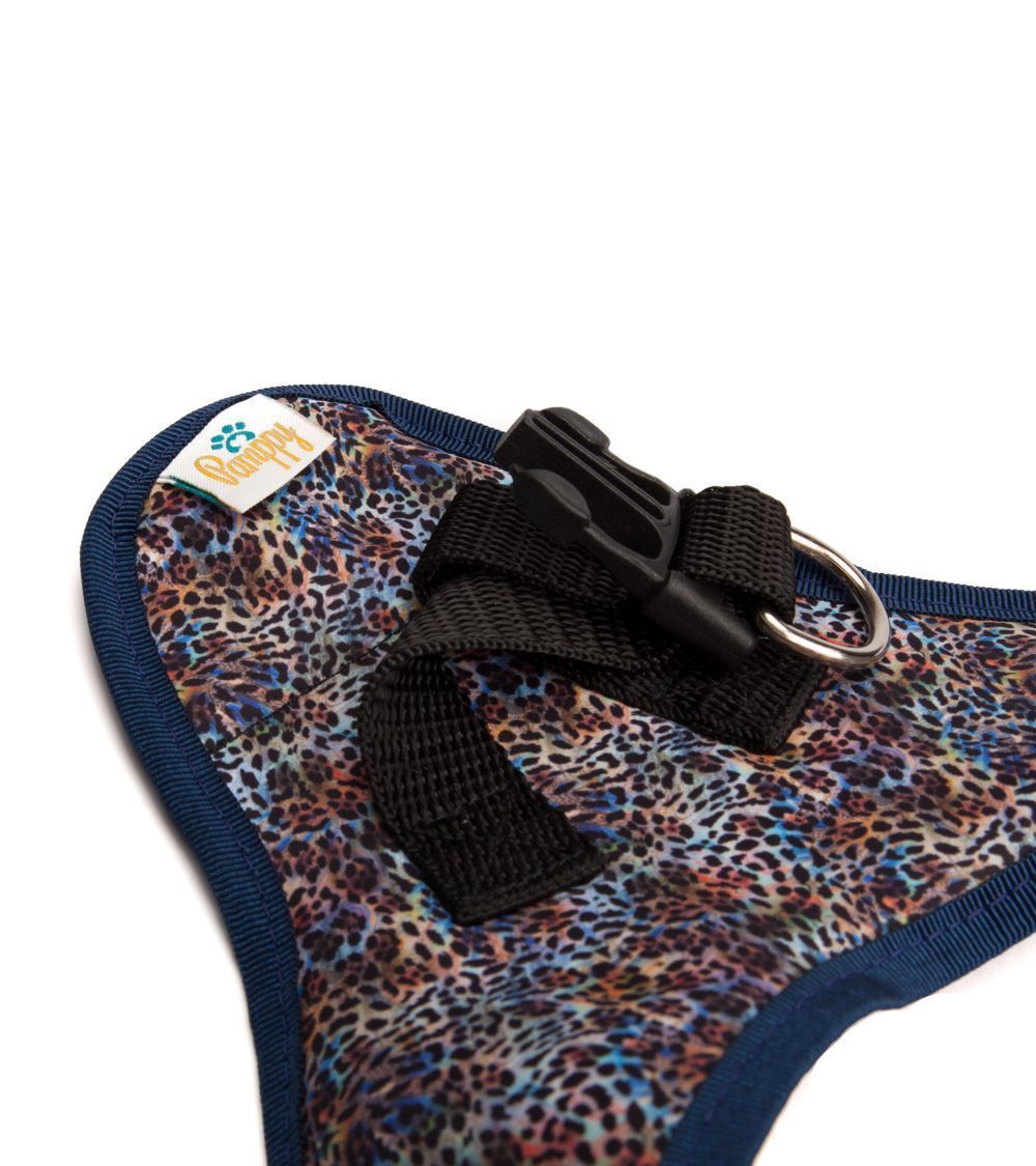 Arnés textil moda en color multicolor con estampado de leopardo con elementos metálicos en color plateado y cierre de plástico, tejido algodón + poliéster al 50% y forro en material PES.
